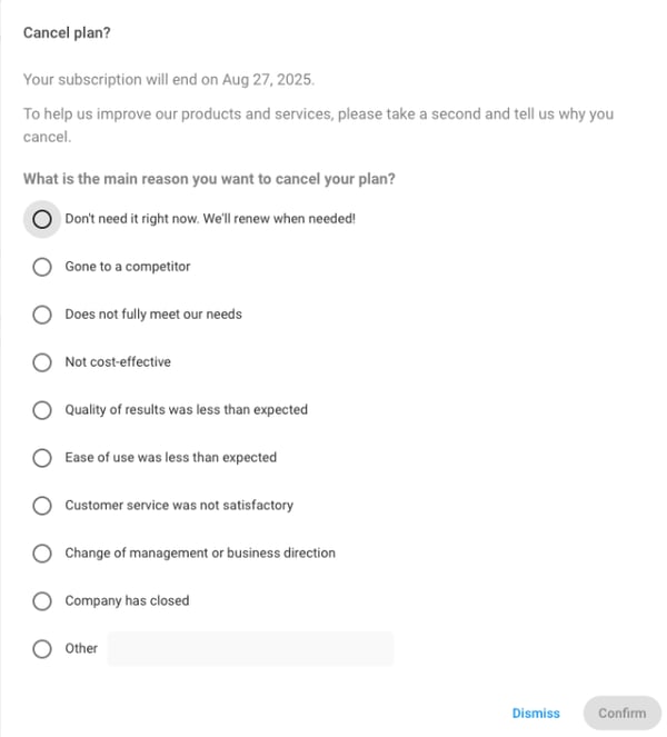 注:サブスクリプションの解約手続きが完了すると、確認メールが送信されます。このメールは、Pix4D に登録されているメールアドレス宛てに送信されます。その受信箱にアクセスできることをご確認ください。