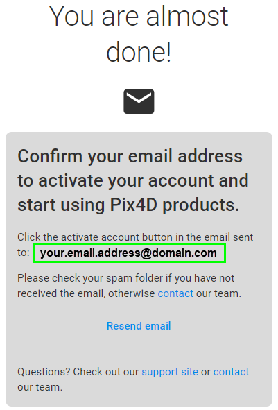 - Noreply email: Some businesses are automatically blocking all messages coming from "norepy" email. Our messages are sent by noreply@pix4d.com. Ensure with your IT system administrator that an exception for noreply@pix4d.com is created. After that, you can click on Resend email.