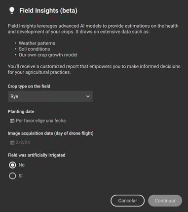 Field Insights is unlocked when the following Vegetation Indices are present: NDVI, NDRE, TGI, and VARI.