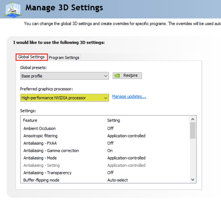 4. In the tab Global Settings, under Preferred graphics processor select High-performance NVIDIA processor from the drop-down list.