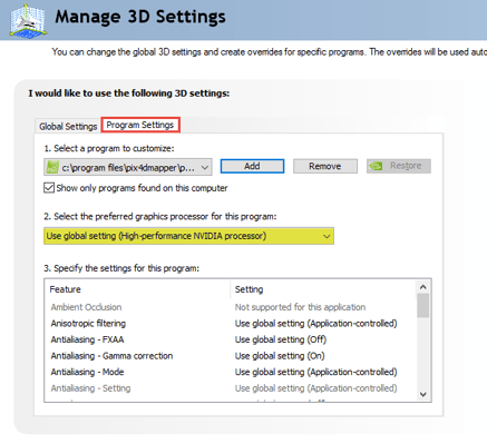 6. Under Select the preferred graphics processor for this program, select Use global setting (High-performance NVIDIA processor) from the drop-down list.
