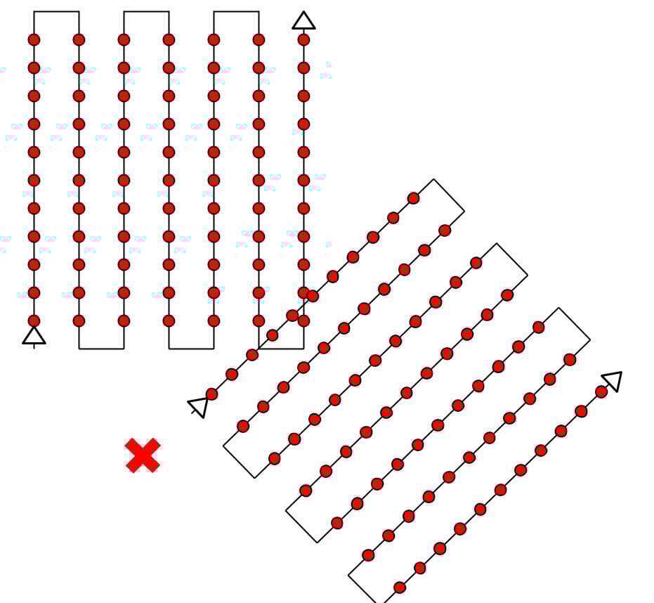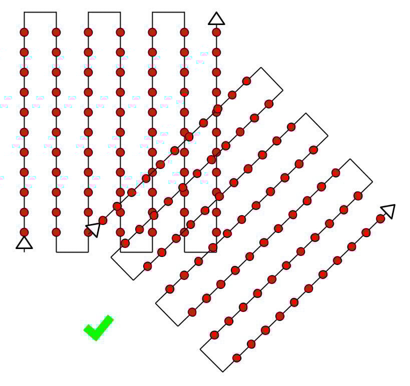 In cases where the terrain is flat with homogeneous visual content such as agriculture fields, it is difficult to extract common characteristic points (keypoints) between the images. In order to achieve good results, it is recommended to use a grid image acquisition plan like the one described in the General Case section by applying the following changes: