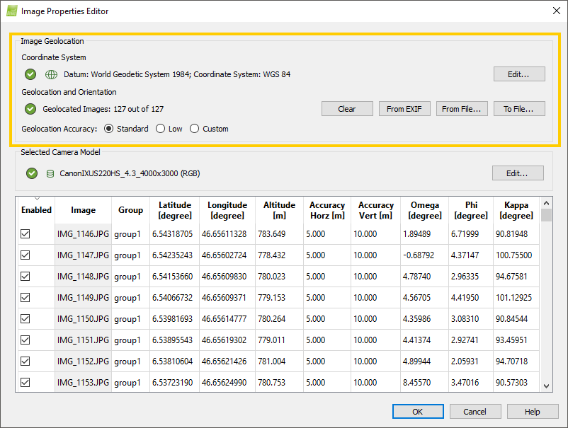 - Geolocation and Orientation: Imports/exports the coordinates and, optionally, the orientation of the images and/or the accuracy of the coordinates.