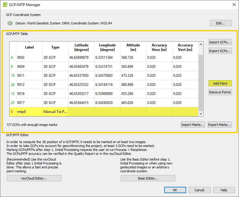 For more information about the GCP/MTP Table properties: GCP / Manual Tie Point Table.