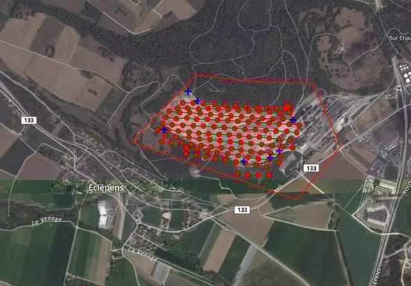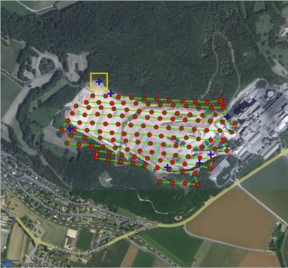 - Flight plan: It displays the flight plan used to take the images as a green line starting from the larger dot (first image).