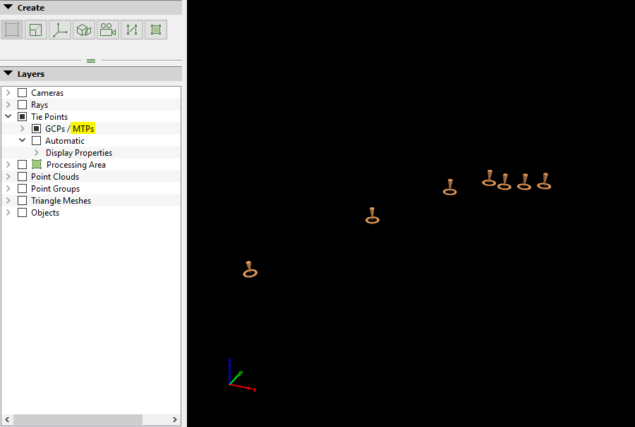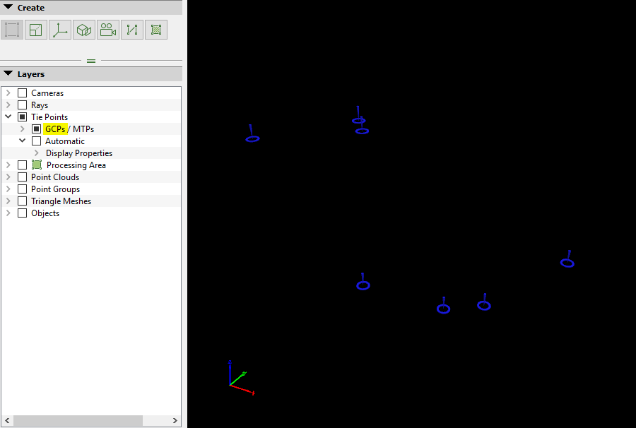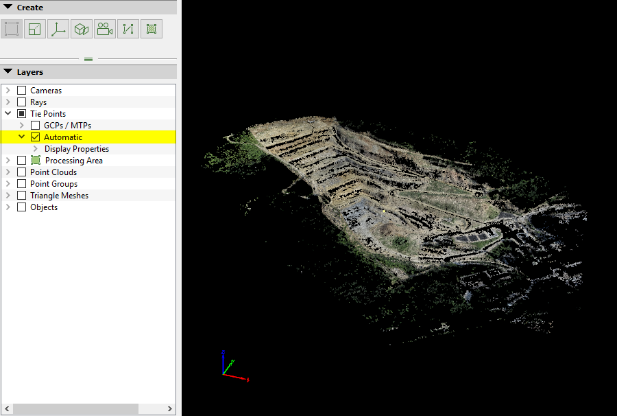 - Tie Points: This layer groups all the Manual Tie Points, GPCs, Check Points, and Automatic Tie Points. The Automatic Tie Points are computed during initial processing.