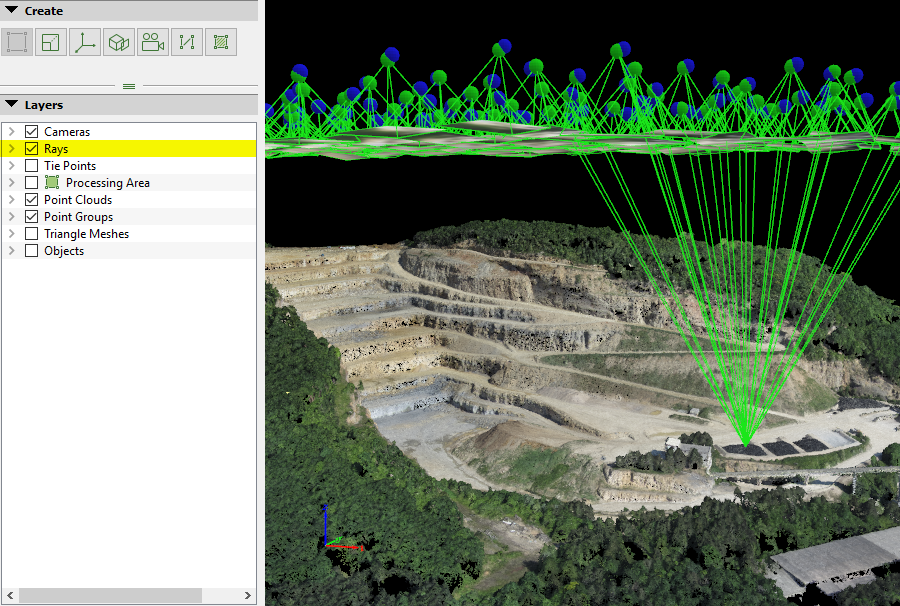 - Green cone: Optimized position of Manual Tie Points, GCPs, Check Points, and vertices of the Objects drawn in the 3D View that are marked in at least 2 images.