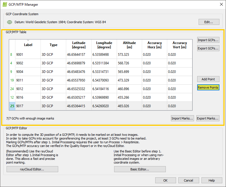 When clicking Remove Points the GCPs/MTPs/Check Points that are displayed on the GCP/MTP Table can be removed. One or multiple points can be selected from the GCP/MTP Table and be removed by clicking Remove Points. For more information about how to select a point on the GCP/MTP Table: GCP / Manual Tie Point Table.