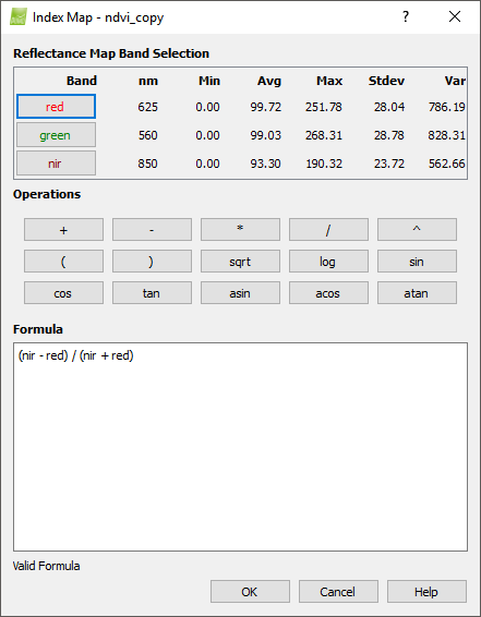 Menu View > Index Calculator > Sidebar > 3. Index Map > Index Map (Formula Editor) - PIX4Dmapper