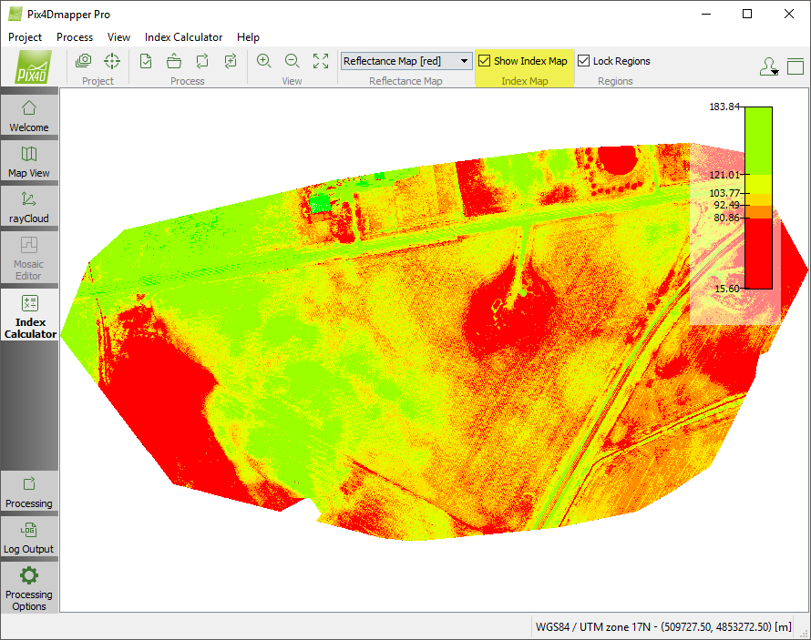 - Index View: Displayed in the main window. When opening the Index Calculator for a project for the first time, it is blank. Once at least one Reflectance Map has been generated, it displays by default the last index that was displayed before the project was closed.
