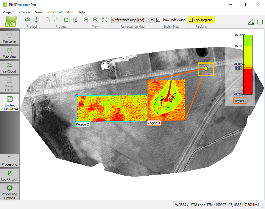 By default the Lock Regions box is selected. After the regions are drawn: Menu View > Index Calculator > Sidebar > 2. Regions, they will be displayed in the Index View. If the Lock Regions box is selected, the region frame will be locked in position. Unselect the Lock Regions box to enable the editing of previously drawn regions by dragging the whole region or a single vertex.