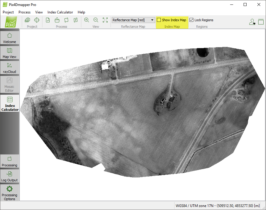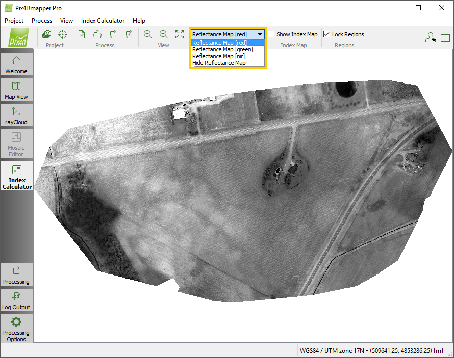 When opening the Index Calculator for a project for the first time, it is blank. Once at least one Reflectance Map has been generated, it displays by default the last Reflectance Map / Index Map that was displayed before the project was closed.