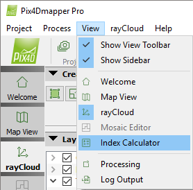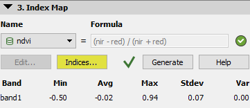 Access: On the Menu bar, click View > Index Calculator (available once step 1 . Initial Processing has been completed). The Index Calculator sidebar is displayed on the right of the main window. On section 3. Index Map, click Indices...