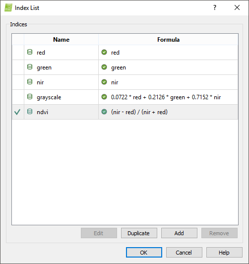 - Select an Index: By clicking on a cell, the row will be selected and depending on the type of index (from the PIX4Dmapper database or user defined) some buttons will be available or grayed out (see above for more information).
