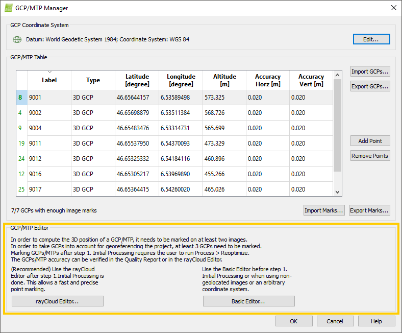 Menu Project > GCP / MTP Manager... > GCP / MTP Editor - PIX4Dmapper