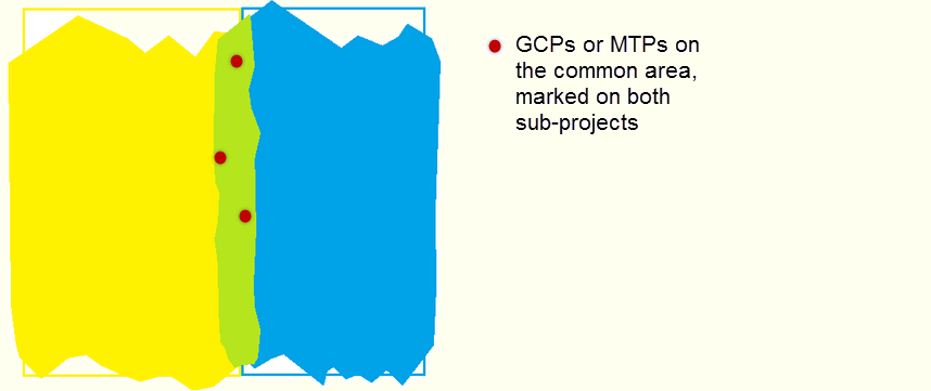 3. Add GCPs (How to include GCPs in the project) and/or Manual Tie Points (How to import and mark Manual Tie Points (MTPs)) on each subproject. The GCPs and/or Manual Tie Points should be homogeneously distributed in the common area of the subprojects. There should be at least three common GCPs and/or common MTPs marked on each subproject.