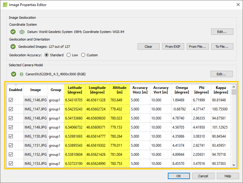2. In the Image Properties Editor, use the image table to verify that for at least 75% of the images the Latitude, Longitude, Altitude (or X, Y, Z) coordinates do not have the value (0,0,0) and are correct.