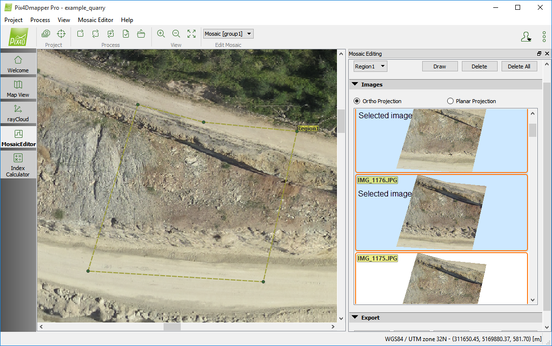 For the Ortho Projection many images can be selected for the edited region. Then, the color of the region will depend on all the images selected rather than only one image. As a rule of thumb, the images selected should be sharp, the area of the region should be in the middle of the image and the image should be as perpendicular to the object as possible.