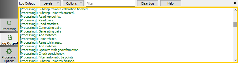 - The log file displayed at the Log Output bar is cleared each time PIX4Dmapper closes. The next time the software is opened, the log file will start registering the different actions from scratch.