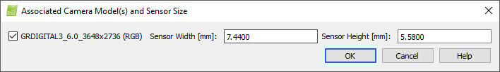 7. (optional) If a Bingo text file (*.txt) is selected, the Associated Camera Model(s) and Sensor Size pop-up appears. Select the associated camera model and edit the sensor width and the sensor height, if they are not detected correctly.