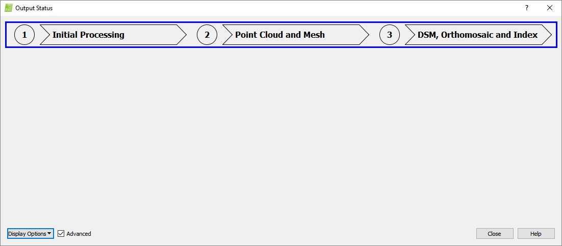The three processing steps, 1. Initial Processing, 2. Point Cloud and Mesh and 3. DSM, Orthomosaic and Index appear in the pop-up Output Status.