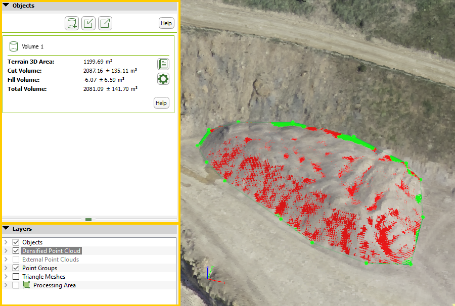 View > Volumes to open the Volumes view. The sidebar is displayed on the left of the main window. The Volumes view is available when the point cloud and the DSM are generated.