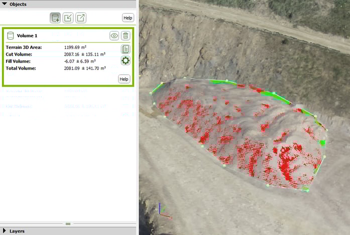 A Volume is an object that can be used for volume calculations. It is defined by a 3D Surface called a base surface. The volume is computed between the base surface and the terrain surface, defined by the DSM.