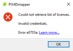 Error e0703a: Could not retrieve list of licenses. Invalid credentials. - PIX4Dmapper