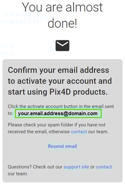 The Pix4D account cannot be activated because the activation email with the activation link has not been delivered to the inbox. The main cause can be a typo in the email address or a filter in the email inbox.