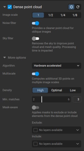 The Dense point cloud step generates a dense point cloud from the images. Besides the default settings, there are two optional selections to make that can directly benefit PIX4Dcatch projects. They are the Noise and Sky filters.