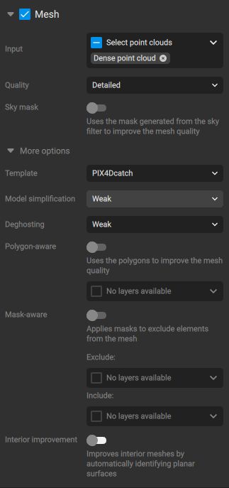 Select to generate a 3D mesh. The Input and Template fields have PIX4Dcatch-specific selections to make.