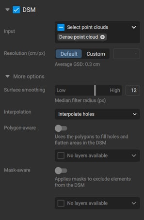 All the DSM settings are outlined in Processing options - DSM. Select the options that provide the most accurate reconstruction depending on the subject.