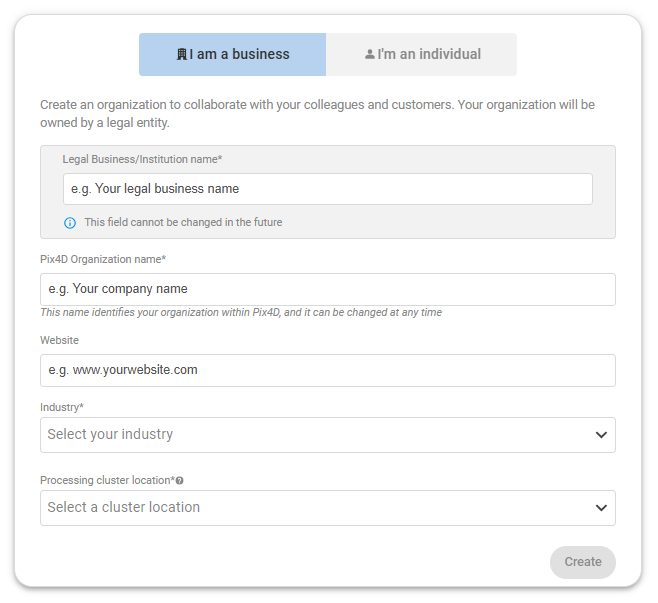- Fill in the details of your organization and click Create.