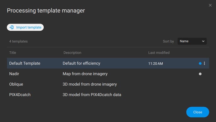 This window displays the Title, the Description, and the Last modified date and time for the custom templates. The blue dot indicates the active processing template and the grey one indicates the default processing template set by the user.