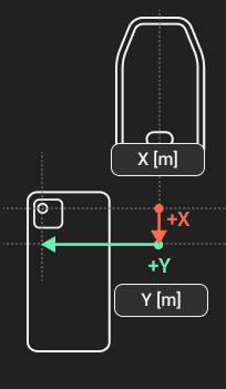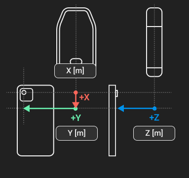 Place the device in portrait mode and the display to the front. Notate the orientation of the X, Y, and Z axes and how they relate to the point of origin on the antenna to measure from. The point of origin resides in the middle of the screw mount at the base of the antenna. It will also be necessary to determine which lens to measure from for devices with multiple camera lenses.