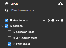 The project can be accessed in PIX4Dcloud like any other project. If Gaussian Splatting was selected as an output in PIX4Dcatch, the project hierarchy will include a new 3D output called Gaussian Splat. This layer is disabled by default and must be re-enabled after refreshing the page or reopening the project. The Gaussian Splat model can also be downloaded just like any other output.