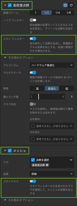 スカイ マスクは、[高密度点群] ステップで生成されたマスクを利用して、メッシュの品質を向上させます。[高密度点群] ステップの実行中に [スカイ フィルター] オプションが有効化されている場合は、既定で有効化されます。