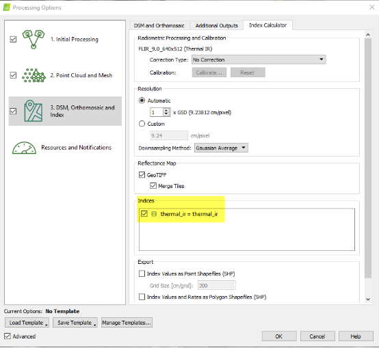 15. Haga clic en Cámara térmica para seleccionar la plantilla y verifique que se haya generado el índice thermal_ir.